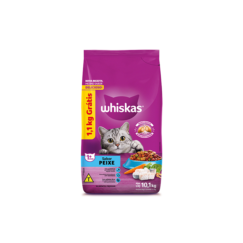 O Whiskas Adultos sabor Peixe é feito com ingredientes selecionados, rico em proteínas e vitaminas essenciais para manter a saúde, energia e vitalidade do seu felino.